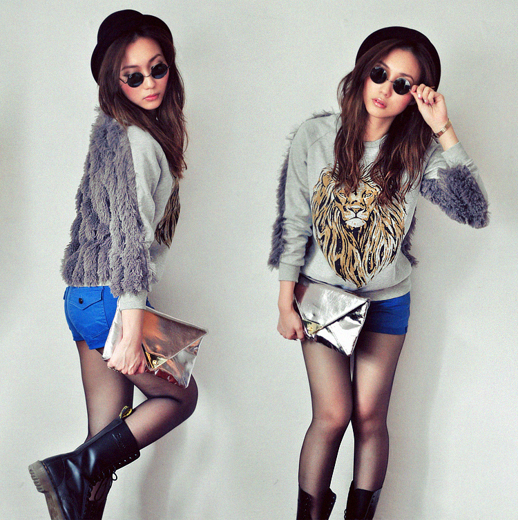. Grey Printed Lion Furry Jumper . Romwe . Electric Blue Shorts . DIY . Silver Envelope Bag . Gift . Boots . Doctor Martens . Shades . Earl Grey Party .