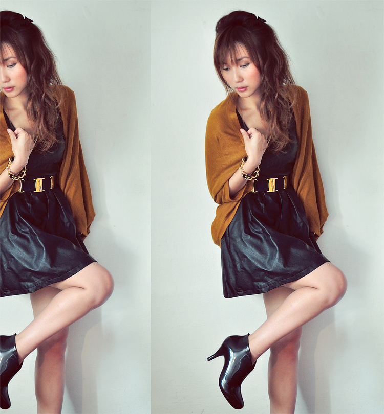 . Black Leatherette Dress . Oh! Poupée . Belt . Salvatore Ferragamo . Dark Mustard Knit Shrug . Earl Grey Party . Heels . Gmarket Korea . Bracelet . Zipia .