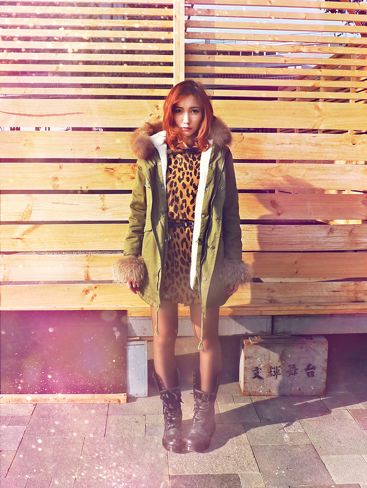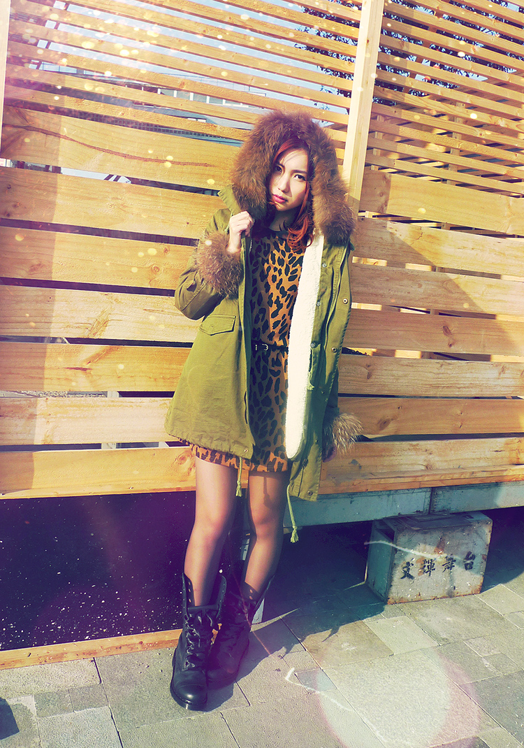 Fur Parka Jacket - Chicwish / Leopard Print Dress - Sheinside / Triumph 1914 W Boots / Dr. Martens / Pastel Vintage Clutch Bag / Gift